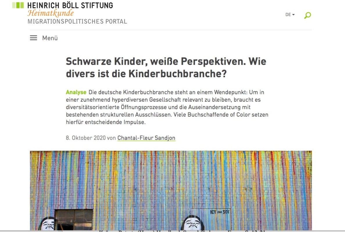 Hier noch einmal der Link: https://heimatkunde.boell.de/de/2020/10/08/schwarze-kinder-weisse-perspektiven-wie-divers-ist-die-kinderbuchbranche?fbclid=IwAR12VV9loYS9HeyYQZkLv-kEJbStRmb4LYSU_ZYlU9hyCx3S-t1eJYW5flU