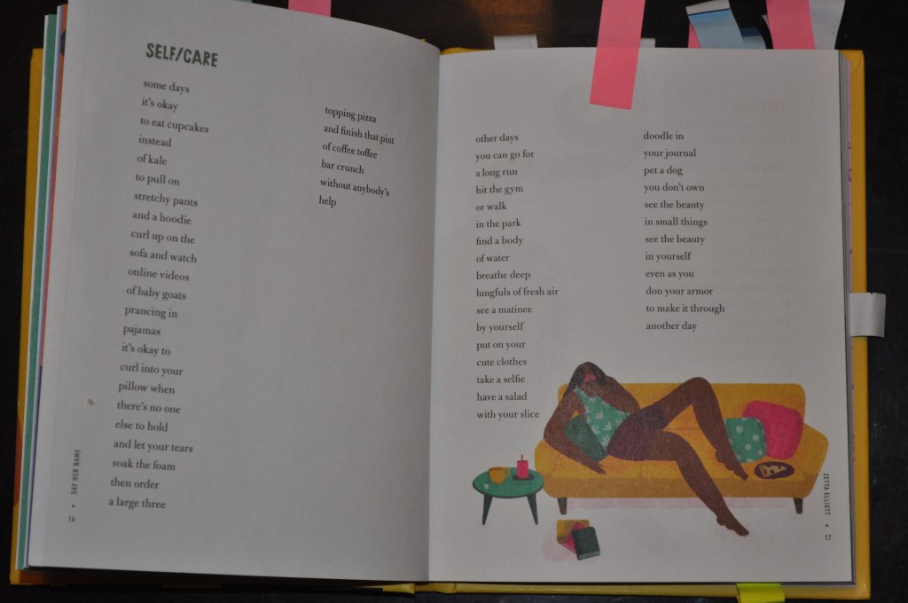 Es ist ewig her, seit ich ein Buch für Schwarzgelesen rezensiert hab. Waren etwas heftige Monate… (nach sehr langem Wunsch endlich schwanger -> Kind in der 13. Woche verloren -> bodenloses Loch und keine Kraft auch nur zu versuchen, daraus rauszukommen.) In diesen Monaten war Zetta Elliotts Say Her Name. Poems to empower ein ständiger Begleiter. Ich weiß, eigentlich wollte ich v.a. Bücher auf Deutsch rezensieren, aber vielleicht braucht gerade jemand dieses Buch genau so dringend wie ich, d.h. ich kann nicht auf eine deutsche Übersetzung warten bis ich das Buch endlich mit euch teile!