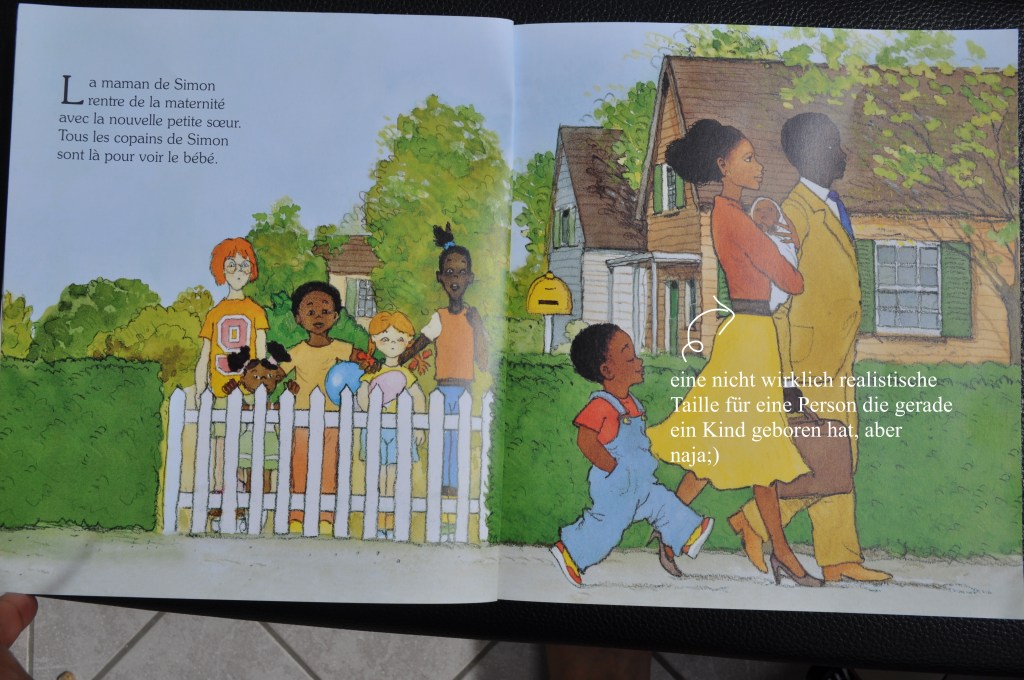 Das Einzige was schade ist, ist dass der Vater gar keine Rolle spielt: er geht am Anfang der Geschichte zur Arbeit und ist dann einfach mal weg:-S Das Buch ist original 1983 (!) erschienen, da waren Väter vielleicht noch nicht wirklich engagiert…? (keine Ahnung, ich war da noch nicht geboren). Und Gottseidank ist mindestens Simon ein Junge, womit die Botschaft „care = Frauensache“ etwas aufgehoben wird.