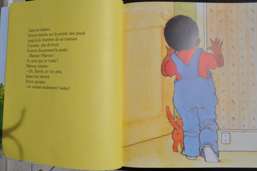-die Bilder, wie so oft in französischen Bilderbüchern, eine eigene kleine Mini“geschichte“ erzählen, die den Text ergänzen: hier geht es um eine Katze, die Simon auf jedem Bild begleitet und, beim Vorlesen für reichlich Gesprächstoff mit meiner Patentochter gesorgt hat.